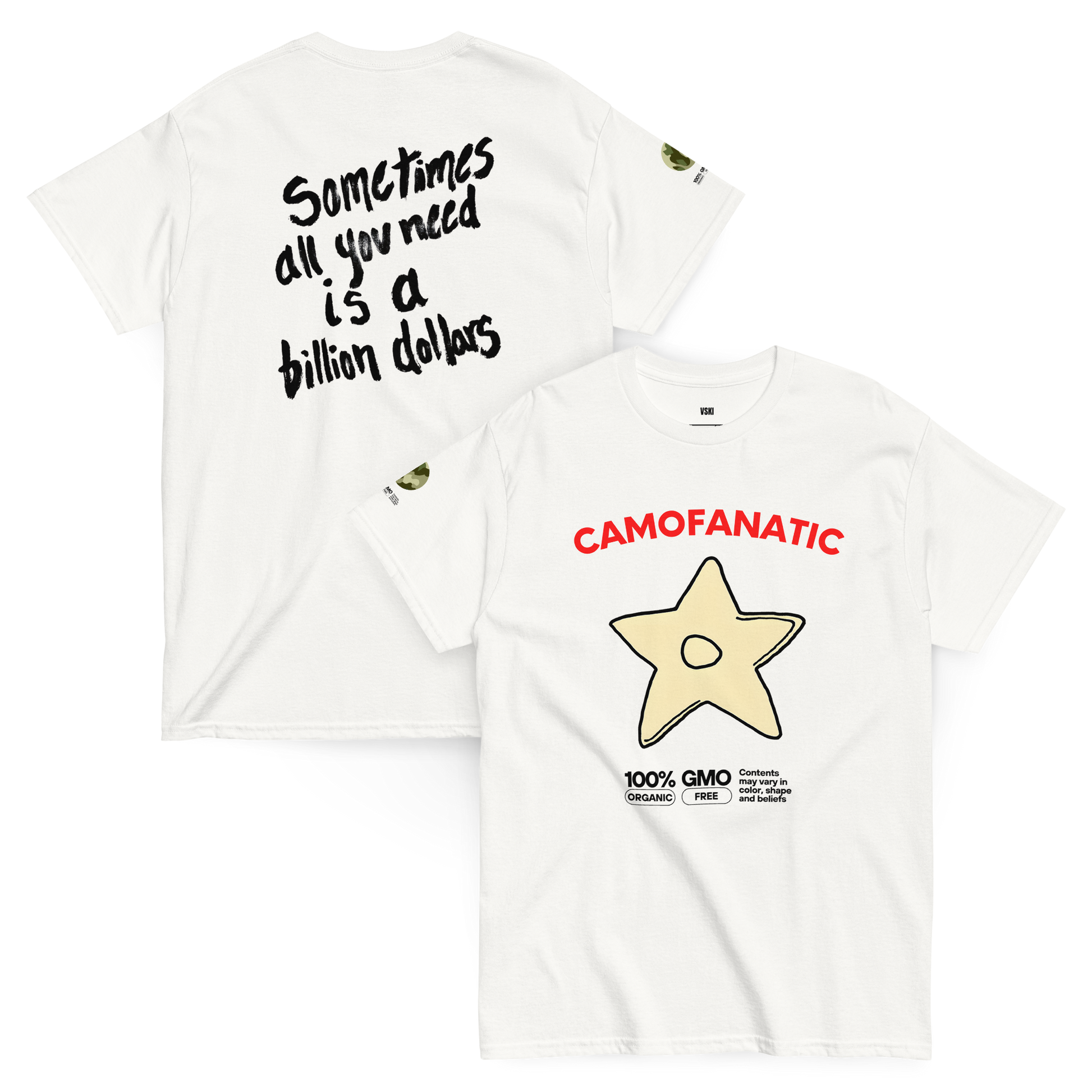 Not just a statement — a mindset. The Billion Dollars T-Shirt is built for those who think bigger and move different. Featuring a bold red CamoFanatics logo on the front with a standout star and subtle messaging about GMOs, organics, and the blurred lines between them — it's more than fashion, it’s coded thought.